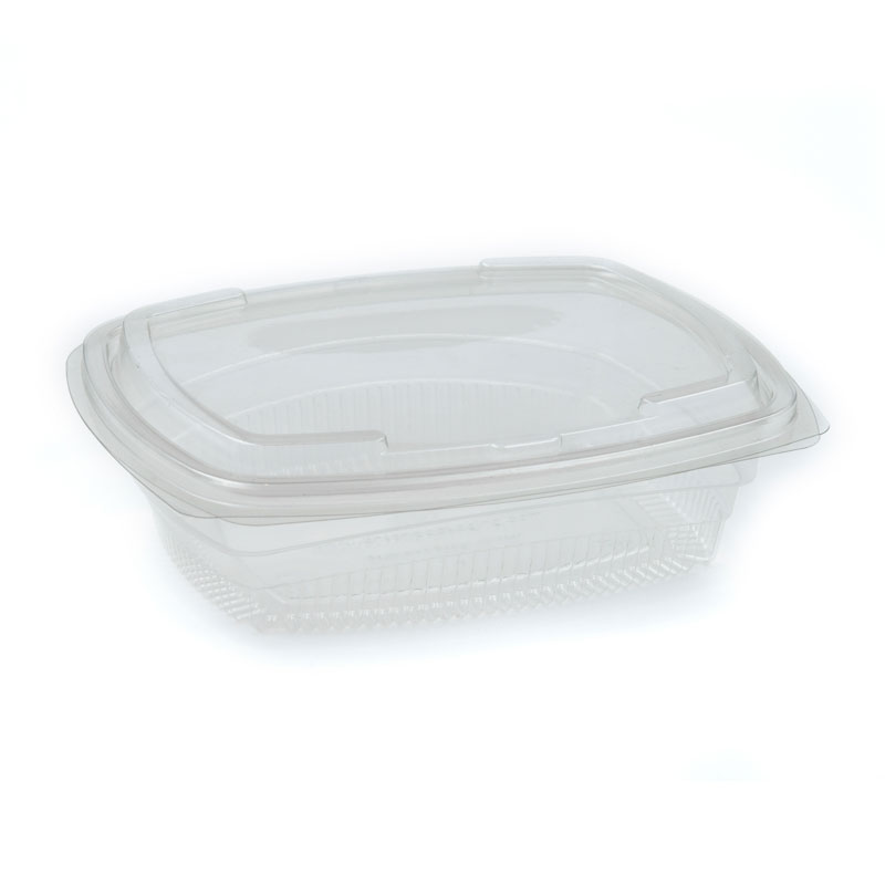 In Stock Our 750ml rectangular hinged containers are made from recycled plastic. The clear, strong, durable containers are uniquely designed to allow for efficient and stable stacking, so you can effectively merchandise your product with eye-catching displays that also conserve shelf space. The lids on the containers provide an excellent seal when shut making the containers leak-proof which is great for transporting cold foods such as takeaway salads, fresh fruits, coleslaw, pasta, olives, cakes, donuts, biscuits and much more.